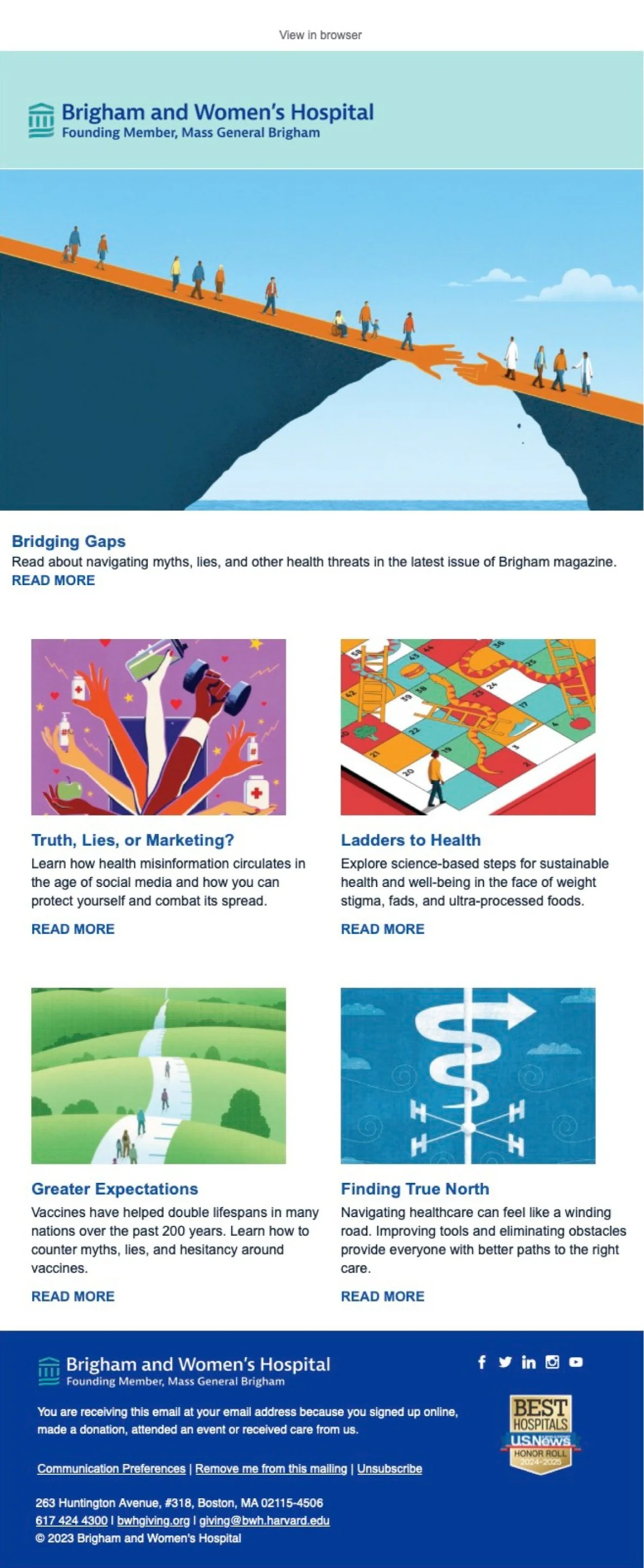 I held the role as the lead web designer and supported digital strategist for seven issues of Brigham and Women’s Magazine, bringing the print edition to life online to reach and engage digital audiences. My role extended across design, development, and marketing strategy—ensuring the magazine was not only visually consistent across platforms but also effectively promoted and accessible.