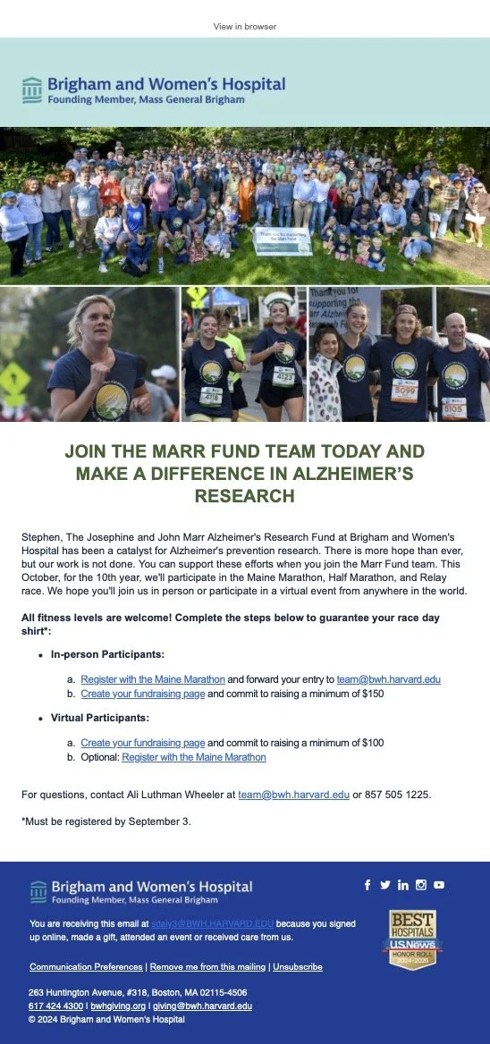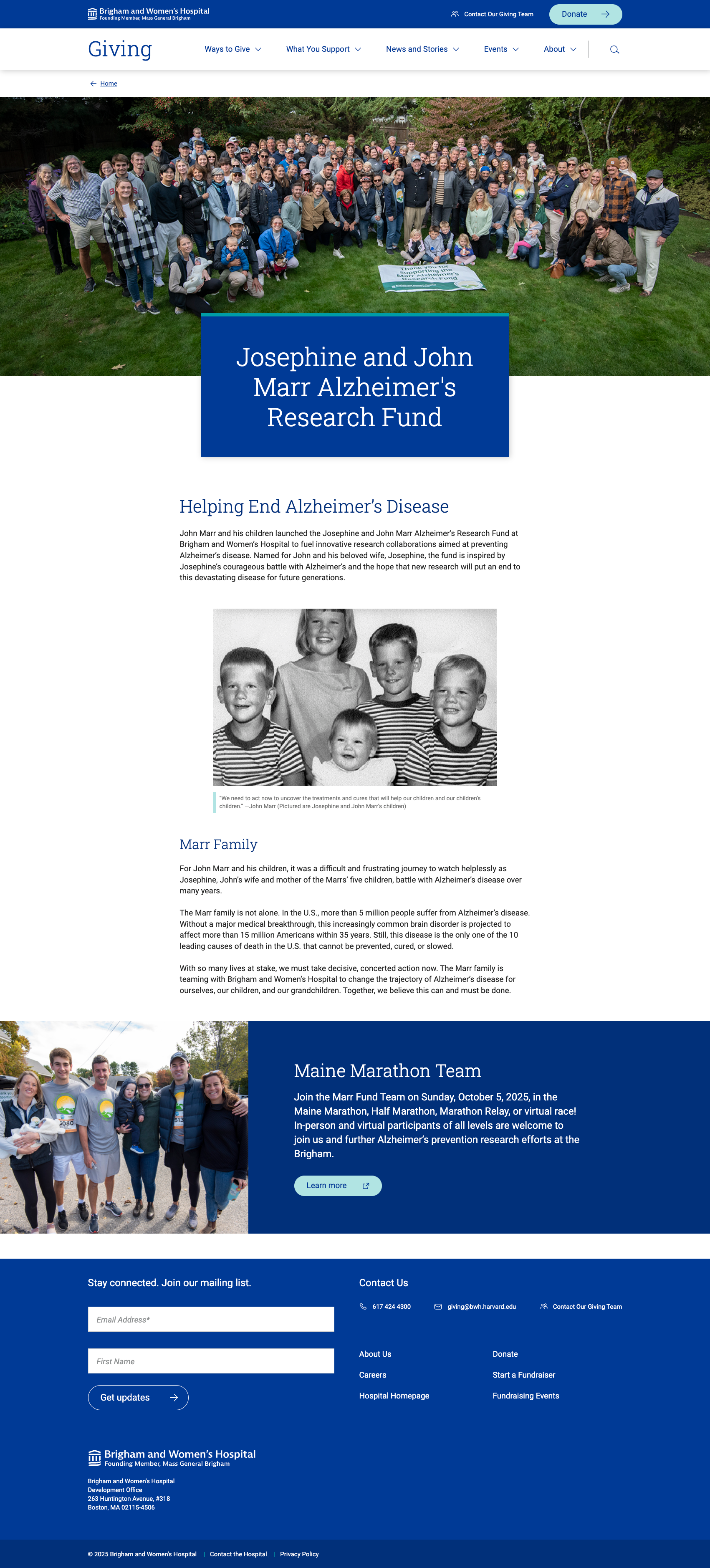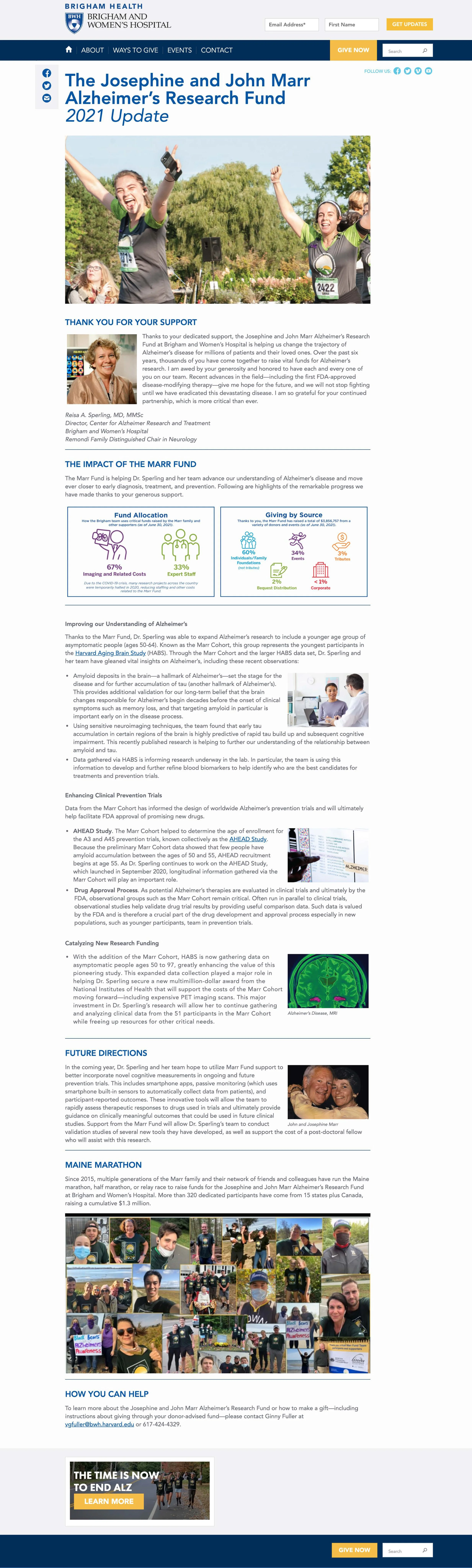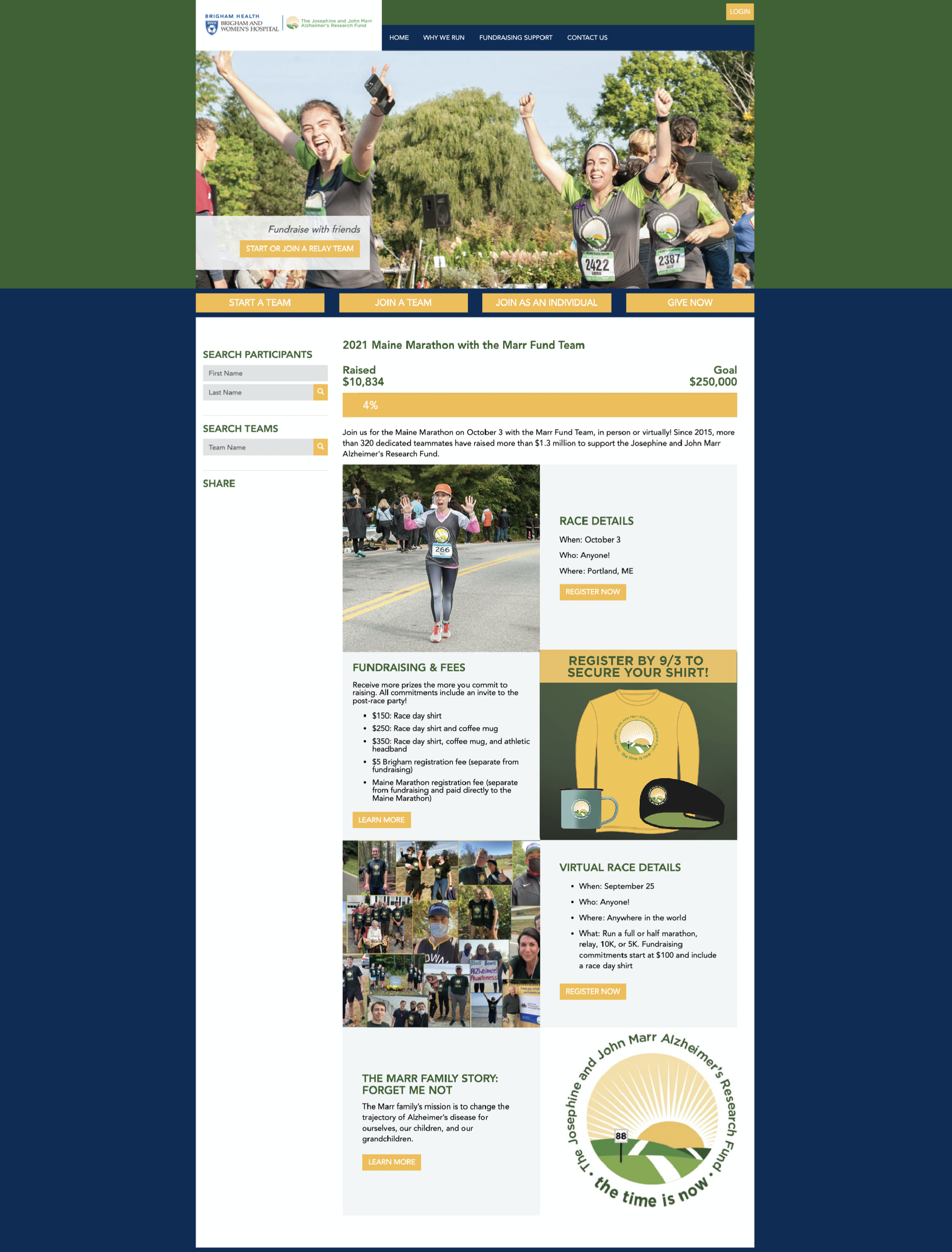 I held the role as the lead designer and supported the digital strategy for the Marr Marathon Program at Brigham and Women’s Hospital, helping translate its mission into a compelling and accessible online experience. My work spanned web design, email development, and platform integration, with a focus on supporting fundraising efforts, improving user experience, and engaging runners and donors through thoughtful, on-brand digital campaigns.